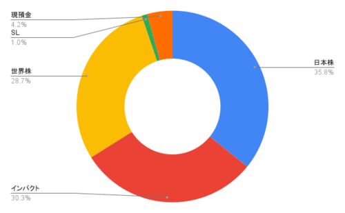 8月末のポートフォリオです。 アセットアロケーション 【目標アセットアロケーション】 日本株 35% インパクト投資 30% 世界株 25% ソーシャルレンディング 1% 預金など 9%