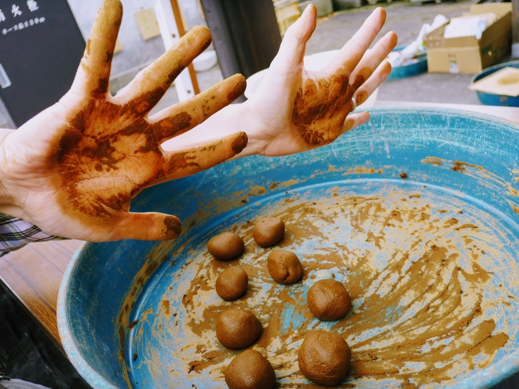 線香を昔ながらに杉の葉とタブの葉だけで作っている馬場水車場の水車で搗かれた杉葉の粉に水を混ぜて団子状にします。