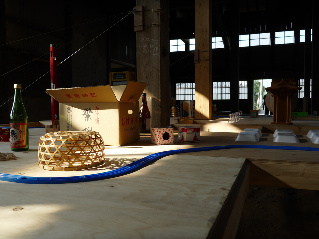 八女の伝統工芸品や日本酒、ラムネの瓶と日用品を組み合わせて作られた世界をプラレールが走る姿はなんとも言えない不思議な空間です。